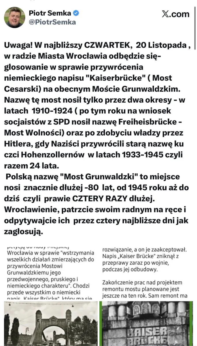 – Tożsamość polska – Wrocław to miasto „odzyskane” po wojnie, most Grunwaldzki symbolizuje polską obecność od 80 lat – dłużej niż pruska nazwa (tylko 24 lata w sumie, w tym nazistowska wersja po 1933). Petycja podkreśla, że to „przywrócenie pruskiego charakteru” budzi emocje, zwłaszcza wśród starszych mieszkańców, dla których to raną po zaborach i wojnie. PiS od lipca br. alarmuje o „germanizacji”, co podgrzewa atmosferę.
