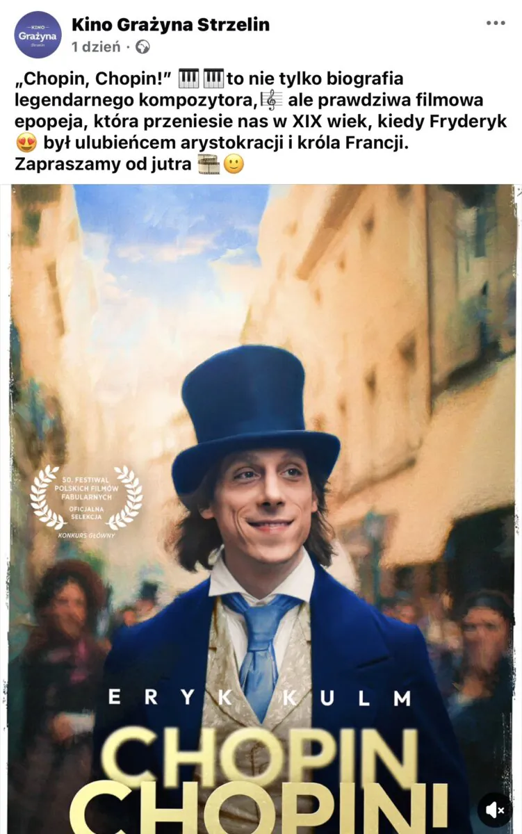 Film „Chopin, Chopin!” w reżyserii Michała Kwiecińskiego, z Erykiem Kulmem w roli tytułowej, wszedł do kin 10 października 2025 roku. To jedna z najdroższych polskich produkcji ostatnich lat – budżet wyniósł ponad 64 miliony złotych (według niektórych źródeł nawet 70 milionów), co czyni ją drugą najkosztowniejszą w historii III RP po „Bogach” (ok. 70 mln zł w 2014 r.). Zdjęcia powstawały w Polsce, Francji i Hiszpanii, a obsada obejmuje międzynarodowe nazwiska, m.in. Joséphine de La Baume jako George Sand czy Victor Meutelet jako Ferenca Liszta. Film skupia się na ostatnich 15 latach życia Fryderyka Chopina (od diagnozy gruźlicy w 1835 r. po śmierć w 1849 r.), przedstawiając go nie jako romantycznego patriotę, lecz jako charyzmatycznego celebrytę paryskich salonów, zmagającego się z chorobą, samotnością i presją geniuszu.