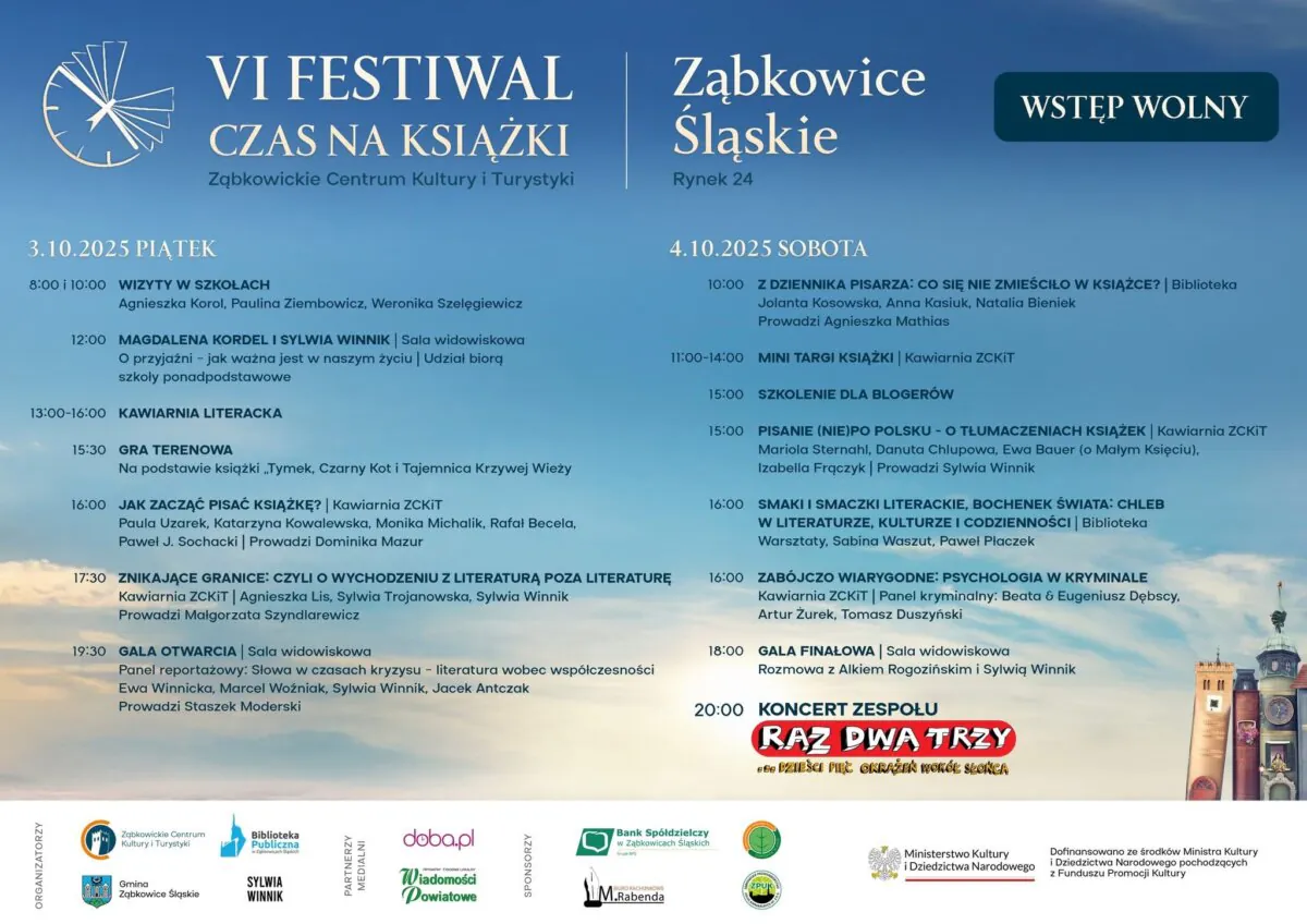 Zapraszamy na dwa dni pełne literackich spotkań, rozmów i emocji – to wszystko czeka na Was w Ząbkowicach Śląskich podczas VI Festiwalu Czas na Książki!