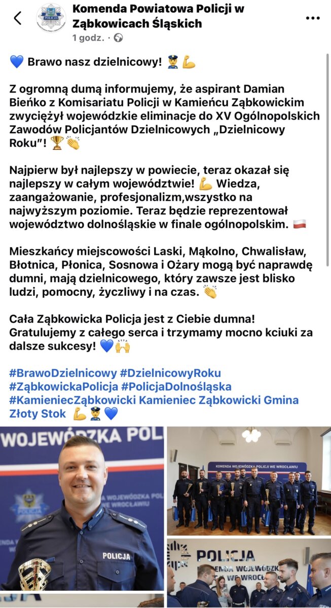 – Z ogromną dumą informujemy, że aspirant Damian Bieńko z Komisariatu Policji w Kamieńcu Ząbkowickim zwyciężył wojewódzkie eliminacje do XV Ogólnopolskich Zawodów Policjantów Dzielnicowych „Dzielnicowy Roku”!