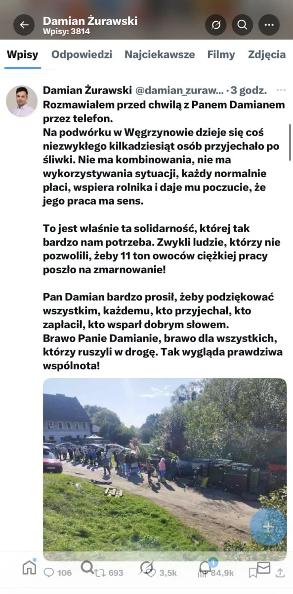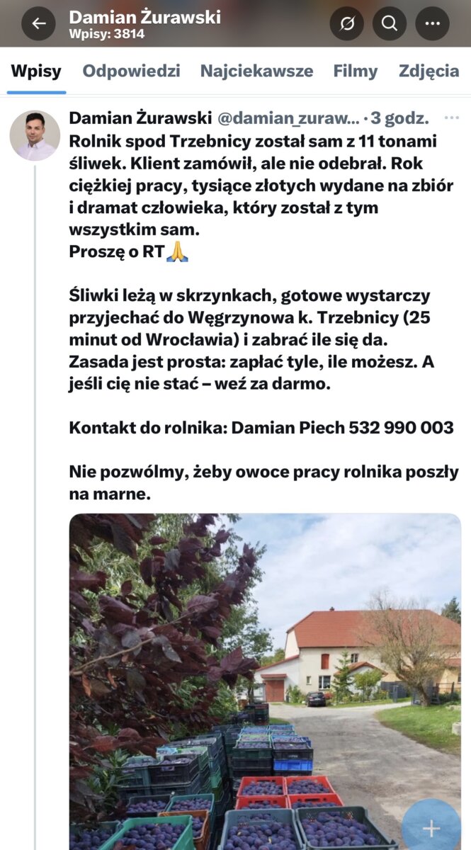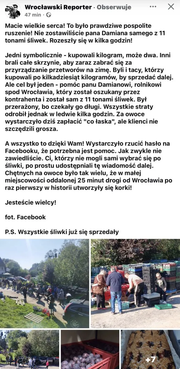 W akcie desperacji sadownik opublikował apel na Wykop.pl pod tytułem „Prośba o pomoc”. Opisał swoją sytuację: „Rok ciężkiej pracy, tysiące złotych wydane na zbiór i dramat człowieka, który został z 11 tonami śliwek”. Prosi o: