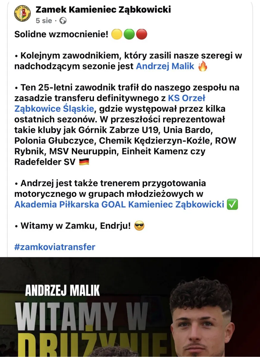 Andrzej Malik to polski piłkarz urodzony 14 października 1999 roku we Wrocławiu, pochodzący z Ząbkowic Śląskich. Jego kariera piłkarska rozpoczęła się w lokalnym klubie KS Orzeł Ząbkowice Śląskie, gdzie trenował od pierwszej klasy szkoły podstawowej. W latach 2013–2015 grał tam w drużynach juniorów młodszych (DLJM) i seniorów (DLJS). W 2015 roku przeszedł do Górnika Zabrze, gdzie występował w zespołach młodzieżowych: juniorów młodszych (LMJM grupa C w sezonie 2015/2016), a następnie w Centralnej Lidze Juniorów (CLJ) oraz Śląskiej Lidze Wojewódzkiej Juniorów A1 (SLWJ-A1) w sezonach 2016/2017 i 2017/2018. Był ofensywnym pomocnikiem, grającym też na lewym skrzydle czy jako środkowy napastnik; mierzył 177 cm wzrostu i ważył 77 kg. Obecnie reprezentuje zespół Zamek Kamieniec Ząbkowicki.