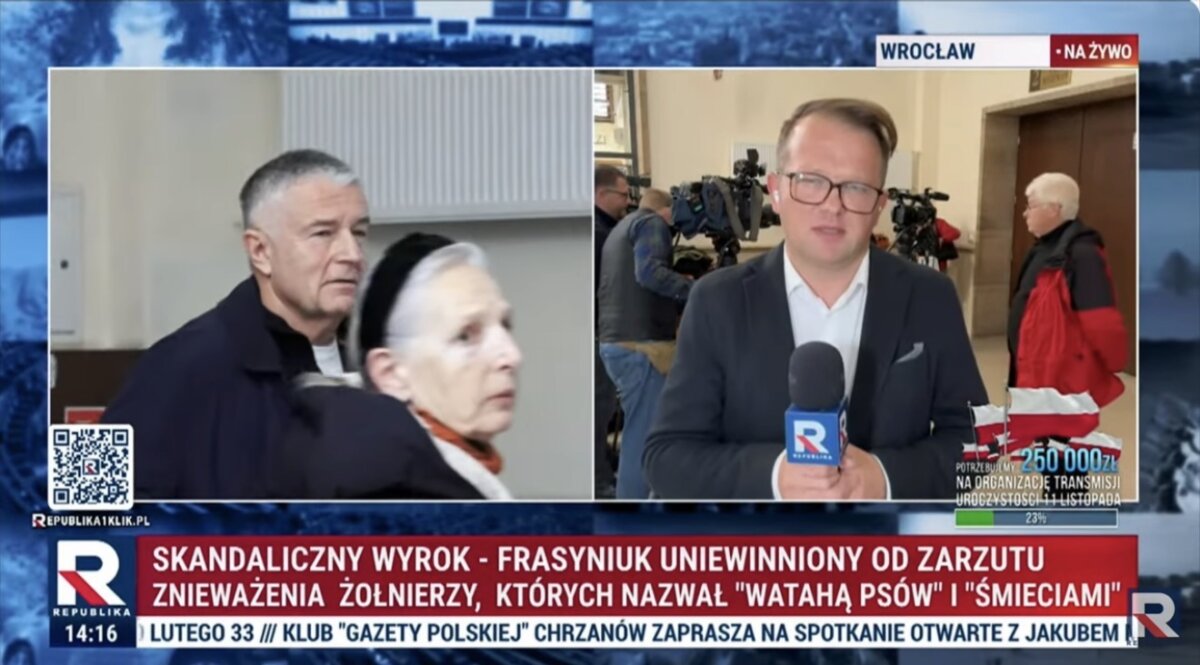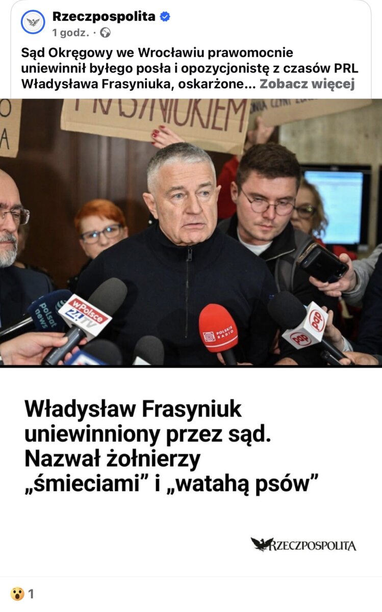 Dzisiaj, 6 listopada 2025 roku, Sąd Okręgowy we Wrocławiu prawomocnie uniewinnił Władysława Frasyniuka z zarzutu znieważenia. Sędzia Piotr Górecki w ustnym uzasadnieniu (podkreślił, że większość wypowiedzi mieści się w granicach dopuszczalnej krytyki, a wyrwane z kontekstu słowa nie przekraczają granic wolności słowa. Sąd zmienił wyrok pierwszej instancji, uznając, że nie doszło do przestępstwa. Koszty procesu pokryje Skarb Państwa. Wyrok jest prawomocny, co kończy sprawę.