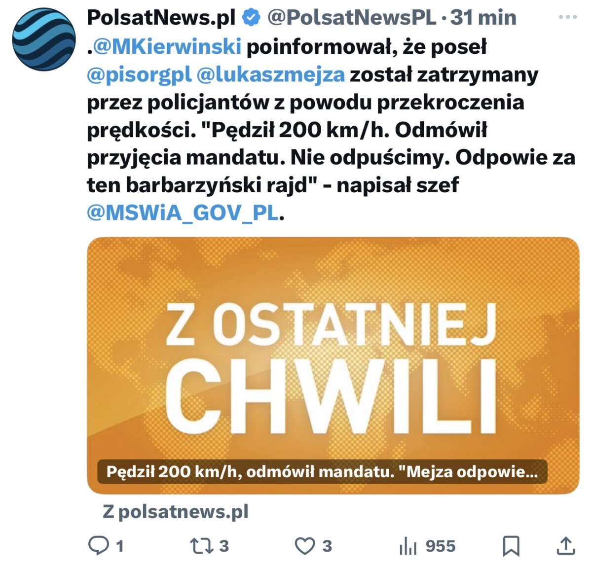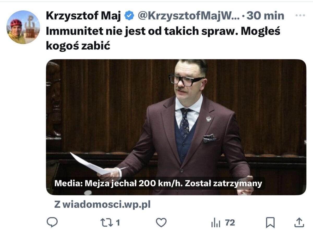– Na X sprawa zyskała viralowy rozgłos – użytkownicy piszą o „barbarzyńskim rajdzie”, ironizują z immunitetu i wspominają poprzednie skandale Mejzy. Przykłady: „Ślepa miłość PiS do Mejzy jest fascynująca” czy „Dokąd oni tak się spieszą?”.