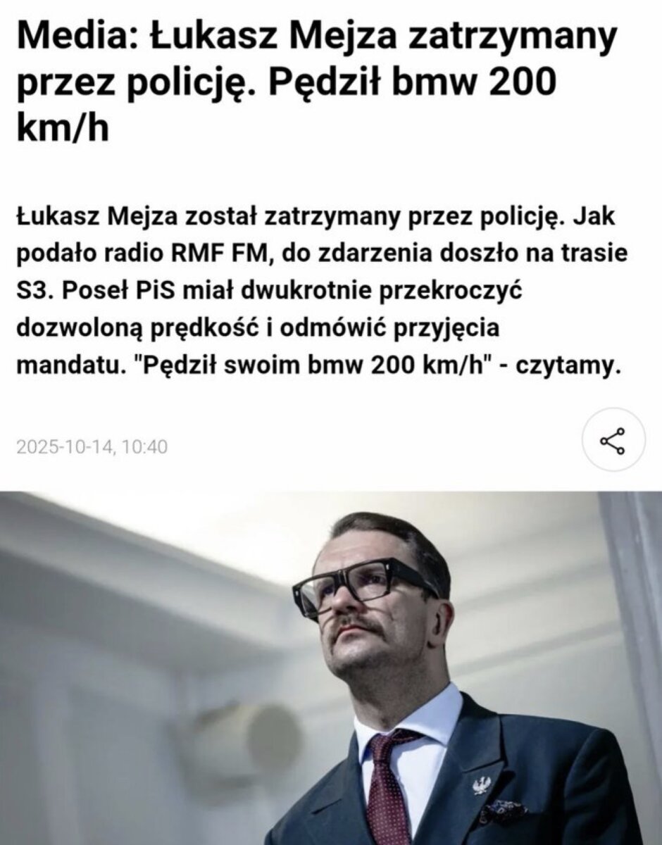 – Marcin Kierwiński (minister MSWiA, KO): Na X skomentował: „Niejaki Mejza pędził 200 km/h. Odmówił przyjęcia mandatu. Bo przecież jest posłem…. posłem PiS. Nie odpuścimy. Policja zrobiła swoje. Mejza odpowie za ten barbarzyński rajd.”