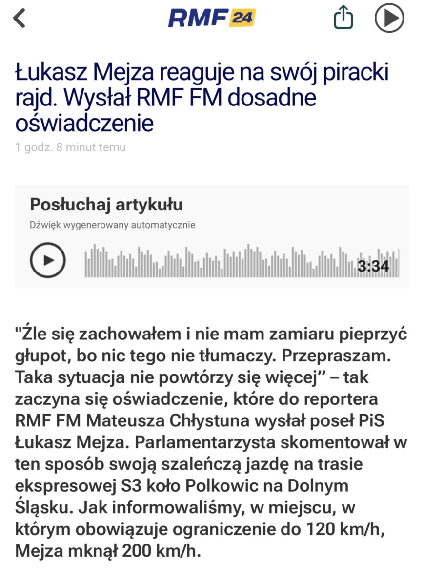 „Źle się zachowałem i nie mam zamiaru pieprzyć głupot, bo nic tego nie tłumaczy. Przepraszam. Taka sytuacja nie powtórzy się więcej. A wszystkim komentującym, w przypływie emocjonalnej ekstazy, cymbałom z Platformy, przypominam, że jechałem na S3, a nie w terenie zabudowanym, jak Donald Tusk w swoim barbarzyńskim rajdzie, po którym stracił prawo jazdy” – napisał w oświadczeniu przysłanym do dziennikarza RMF FM poseł PiS Łukasz Mejza.