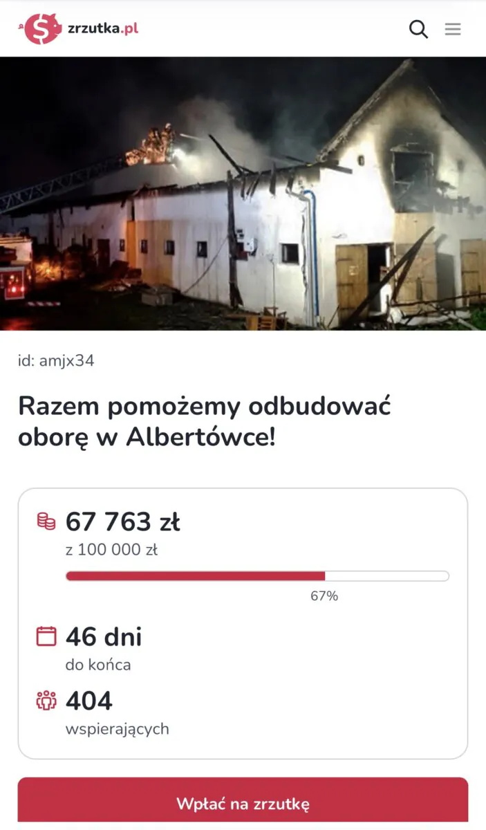 No i stał się cud! Na apel błyskawicznie odpowiedziało 404 darczyńców, którzy na konto „Albertówki”, przez portal zrzutka.pl, wpłaciło 67.763 złotych. Dzięki temu udało się już odbudować dach spalonej obory. Trwają jeszcze prace wykończeniowe. Jest już pewne, że wszystkie zwierzęta wrócą, do tego odbudowanego po pożarze miejsca, jeszcze przed zimą!