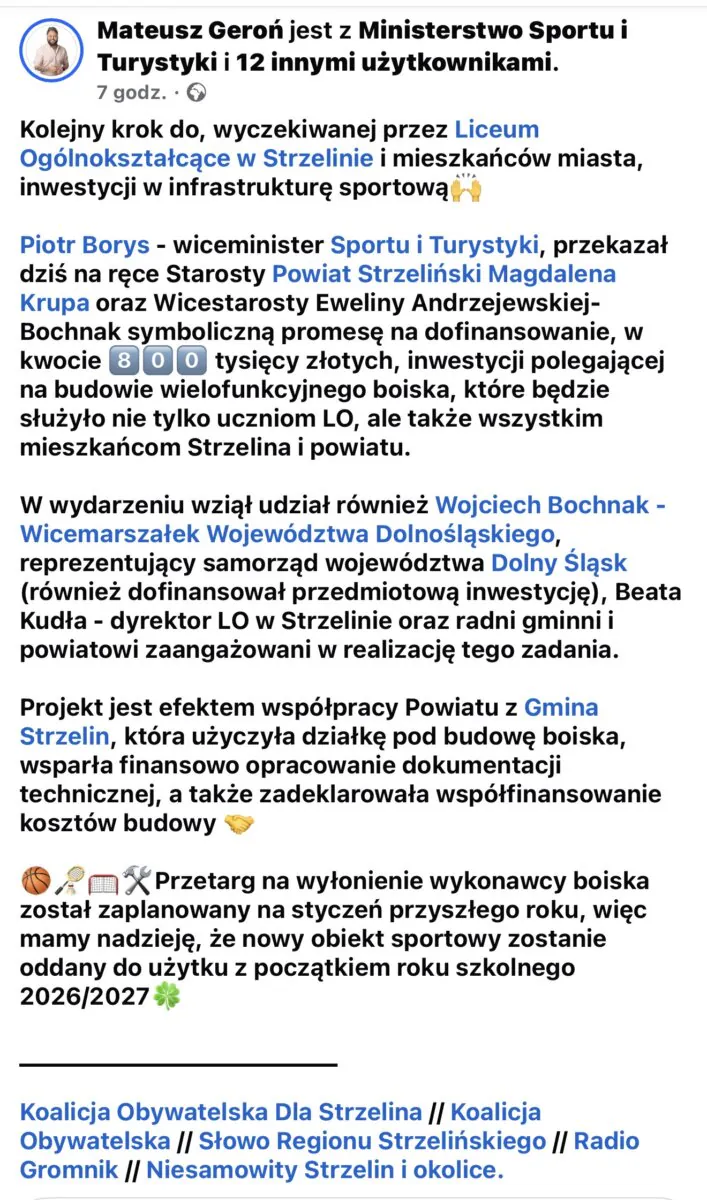 – W ostatnim czasie Ministerstwo Sportu i Turystyki dofinansowało Powiat Strzeliński kwotą ok. 800 tys. zł na budowę kompleksu boisk sportowych przy Liceum Ogólnokształcącym w Strzelinie.