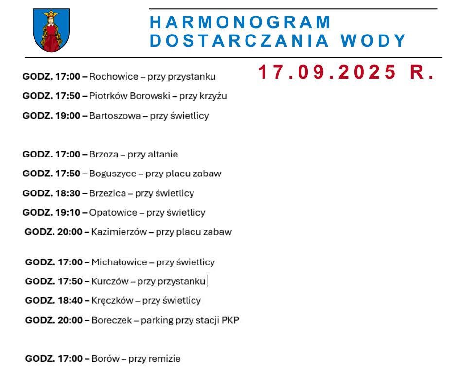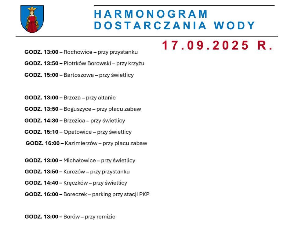 HARMONOGRAM DOSTARCZANIA WODY PITNEJ – 17.09.2025 r.