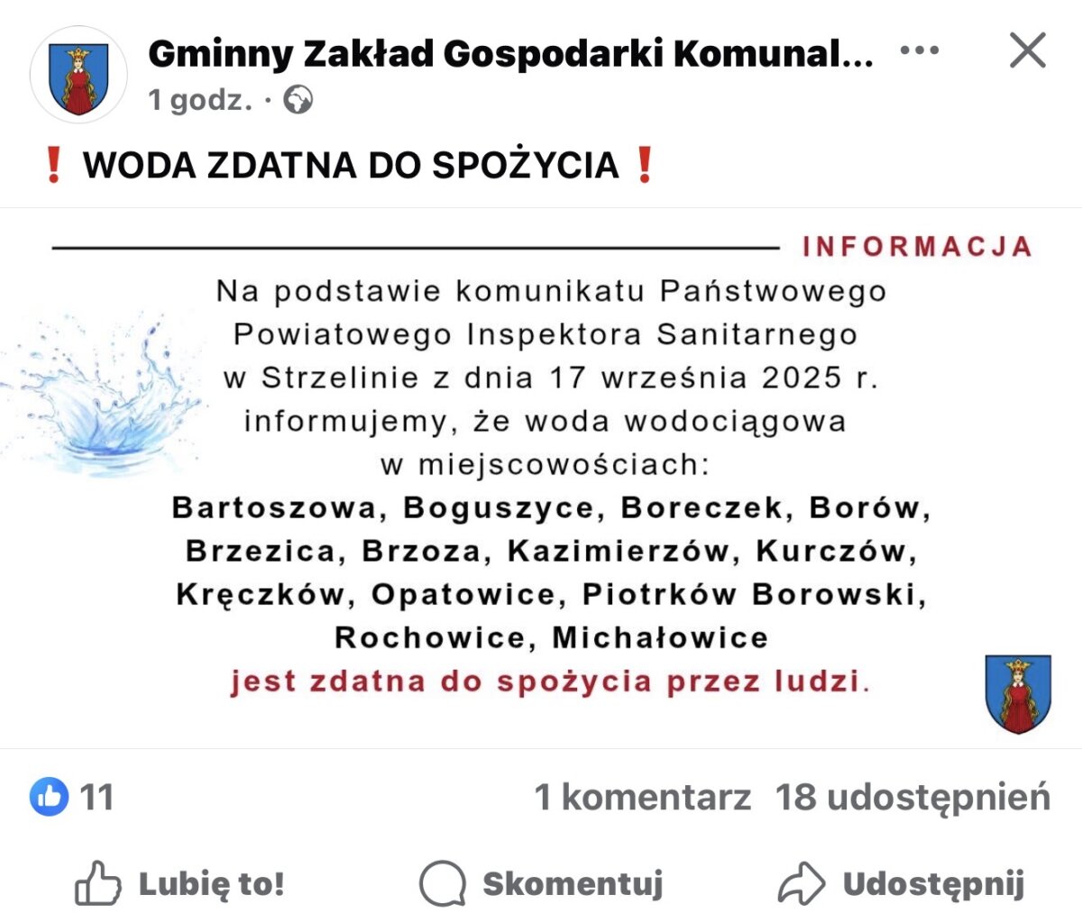 W związku z komunikatem z dnia 15.09.2025 roku, wydanym przez Państwowego Powiatowego Inspektora Sanitarnego w Strzelinie, Gminny Zakład Gospodarki Komunalnej w Borowie informuje, że woda z SUW Borów, nie nadaje się do spożycia przez ludzi.