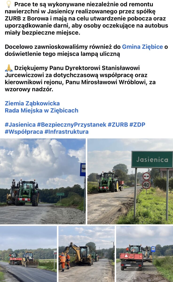 Jasienica cieszy się z nowej nawierzchni drogi powiatowej nr 3170D w Jasienicy. W granicach miejscowości, czyli na długości prawie 700 m, położono nowy asfalt, są umocnienia poboczy, wykonana nowa podbudowy w miejscach przełomów i prace związane z odwodnieniem. Prace – na zlecenie Zarządu Dróg Powiatowych – wykonała firma ZURB z Borowa za kwotę 642 tys. zł. Zadanie współfinansowane przez Gminę Ziębice.