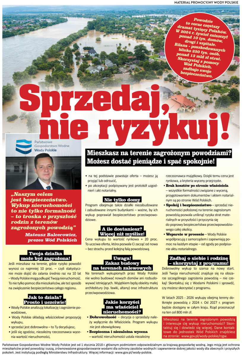 Powodzie stają się coraz poważniejszym zagrożeniem, szczególnie dla mieszkańców terenów położonych w sąsiedztwie rzek. W odpowiedzi na rosnące ryzyko Skarb Państwa oferuje możliwość wykupu nieruchomości o wysokim zagrożeniu powodziowym (w zasięgu wody 10-letniej). To szansa na zwiększenie bezpieczeństwa i uniknięcie przyszłych strat materialnych.