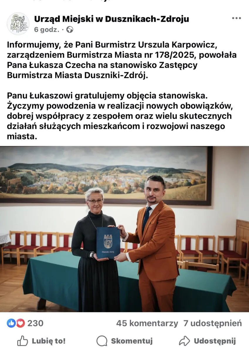 Przypomnijmy. Pani Urszula Karpowicz, wybrana na burmistrza Dusznik-Zdroju w przedterminowych wyborach 26 października 2025 roku (zdobyła ponad 61% głosów w pierwszej turze), złożyła ślubowanie 7 listopada 2025 r. podczas sesji Rady Miejskiej.
