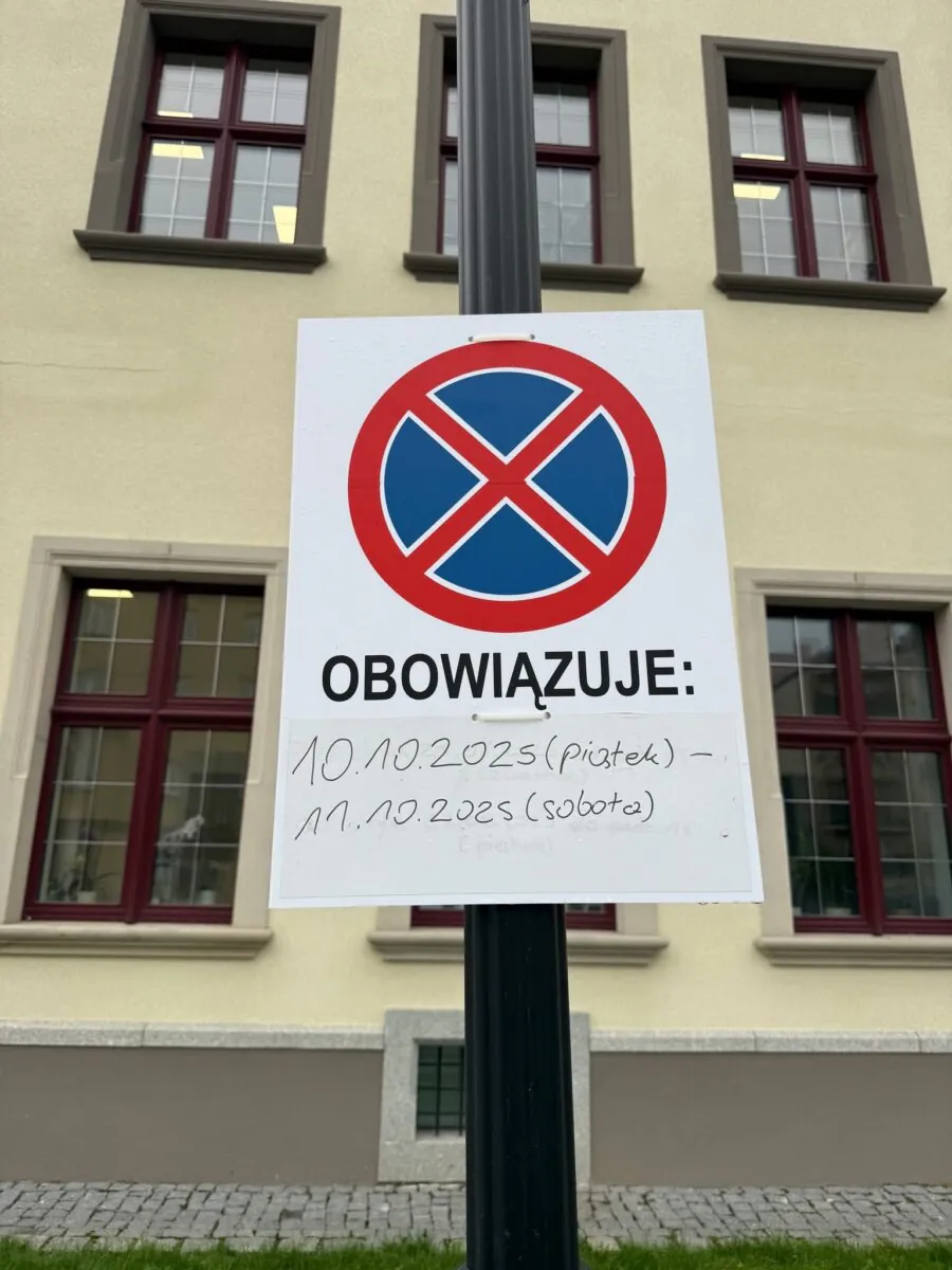 Dodatkowo zostaje wprowadzony zakaz parkowania w dniach 10-11.2025r. (piątek-sobota) na miejscach parkingowych znajdujących się po wewnętrznej stronie Rynku. W miejscu z zakazem parkowania są powieszone tablice informacyjne.