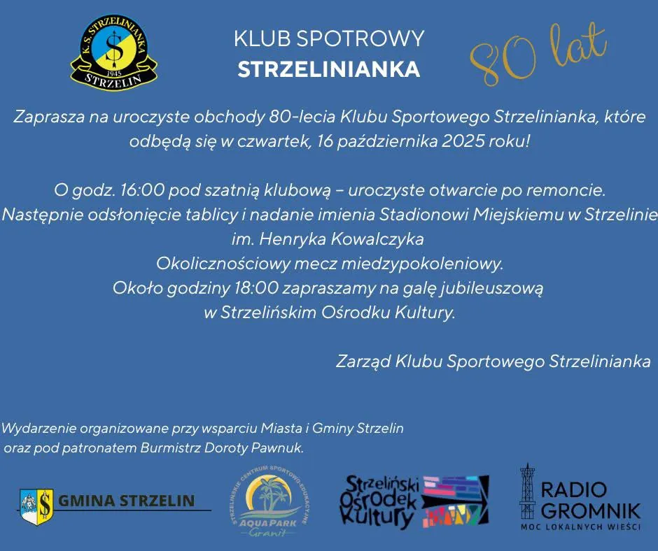 Z ogromną radością zapraszamy Was na uroczyste obchody 80-lecia Klubu Sportowego Strzelinianka, które odbędą się w czwartek 16.10.2025 roku.