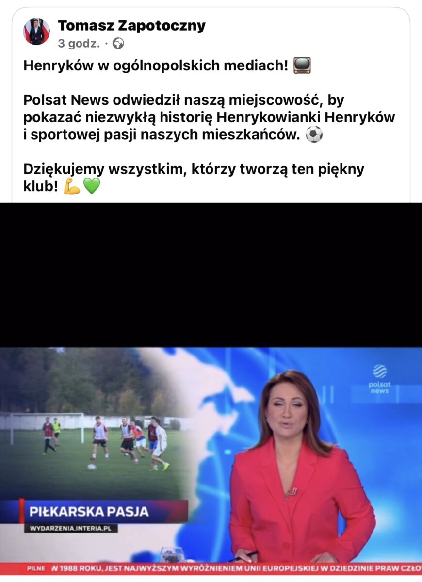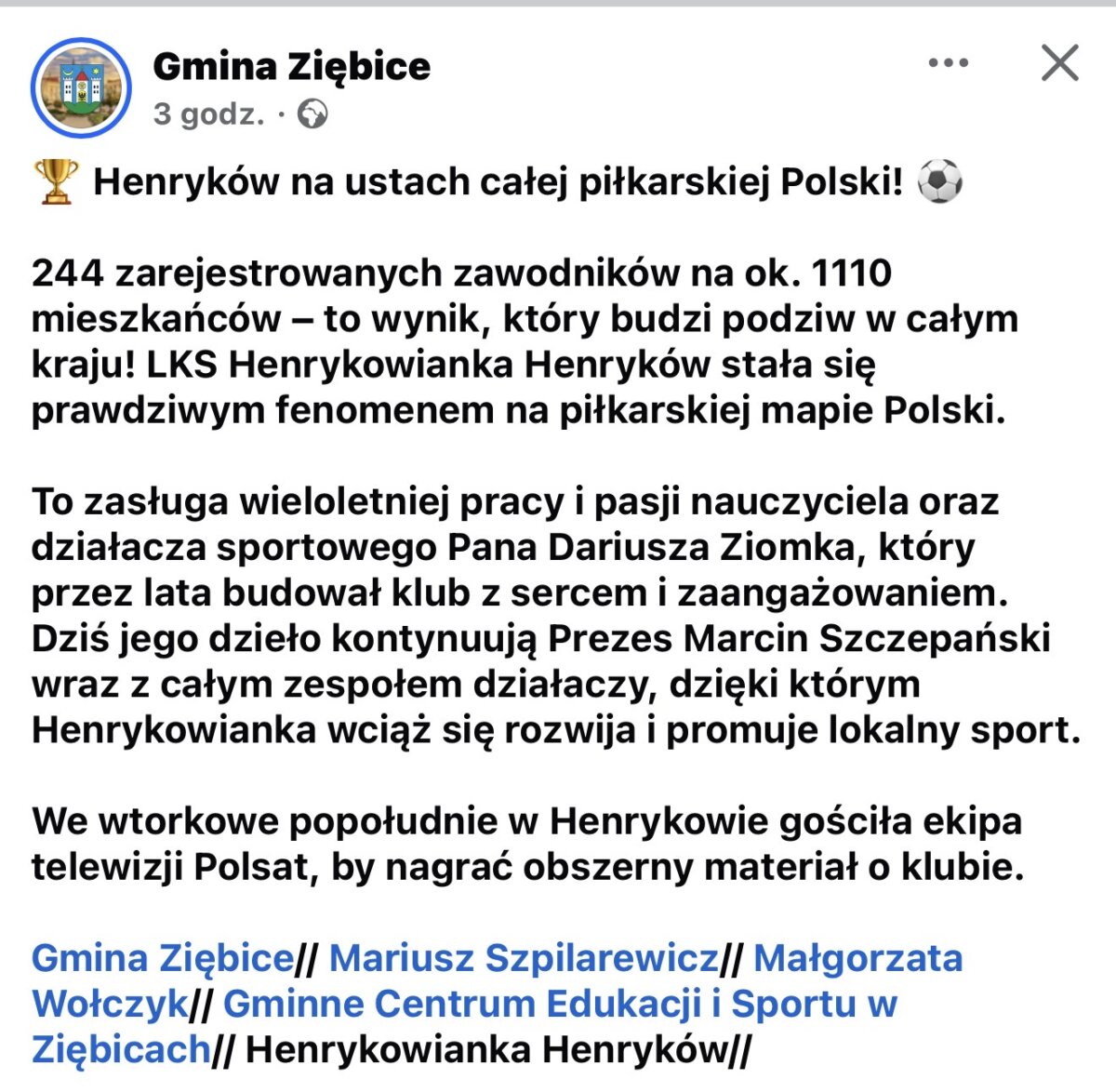 Dzisiaj (22.10) w Polsacie News ukazał się reportaż z Henrykowa w gminie Ziębice. Miejscowość już nie jest znana tylko z „Księgi Henrykowskiej”. Do historii Klasztoru Cystersów i Katolickiego Liceum Ogólnokształcącego dołączyli dziś działacze i zawodnicy miejscowej Henrykowianki, w której gra co trzeci mieszkaniec wsi…