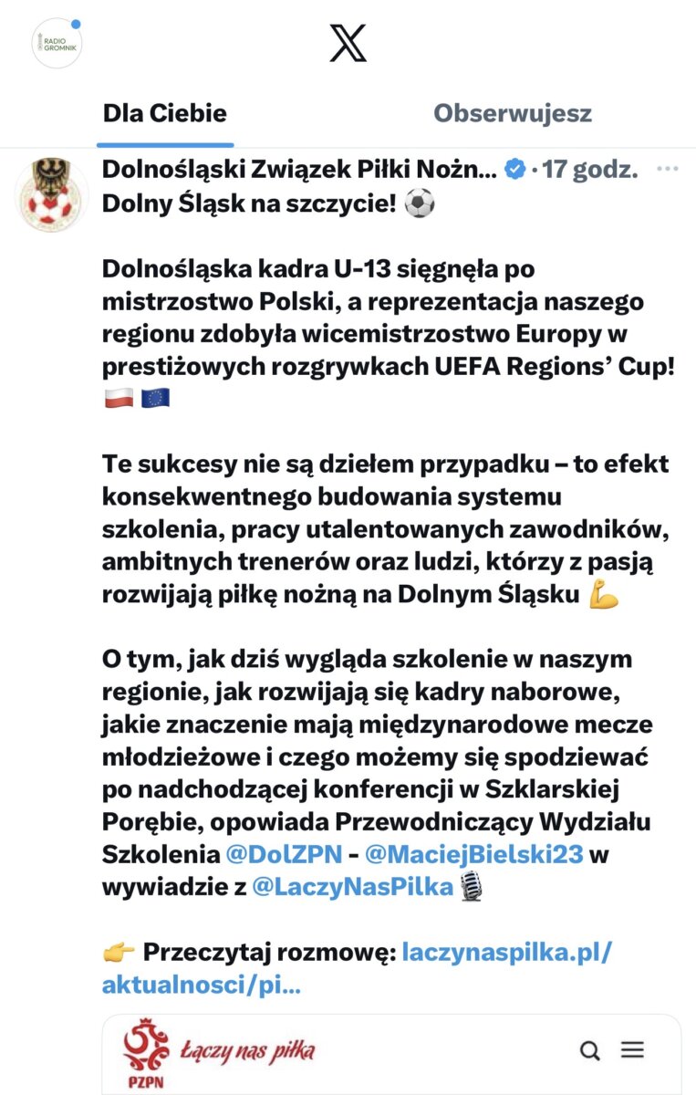 Dolnośląska kadra U-13 sięgnęła po mistrzostwo Polski, a reprezentacja Dolnego Śląska zdobyła wicemistrzostwo Europy w prestiżowych rozgrywkach UEFA Regions’ Cup. Sukcesy te nie są dziełem przypadku – to efekt konsekwentnego budowania systemu szkolenia, pracy utalentowanych zawodników i ambitnych trenerów, którzy nie boją się sięgać po nowoczesne rozwiązania. O tym, jak wygląda dziś szkolenie na Dolnym Śląsku, jak rozwijają się kadry naborowe, jakie znaczenie mają międzynarodowe mecze młodzieżowe oraz czego spodziewać się po nadchodzącej konferencji w Szklarskiej Porębie – opowiada Maciej Bielski, przewodniczący Wydziału Szkolenia Dolnośląskiego Związku Piłki Nożnej.