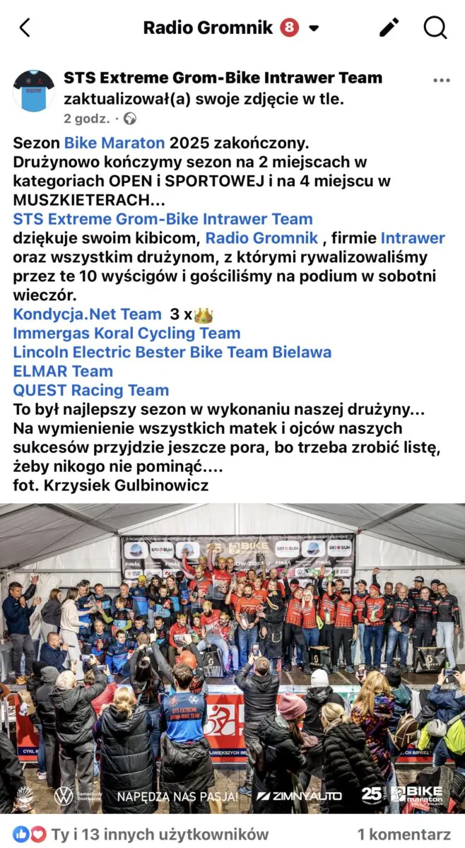 Klub podkreśla, że sukcesy to efekt pasji i lokalnego wsparcia – od anonimowych wolontariuszy utrzymujących ścieżki po sponsorów jak Intrawer. W 2025 roku celują w podium całego Bike Maratonu. Więcej na Facebooku: STS Extreme Strzelin Grom-Bike Team lub Strava: STS EXTREME STRZELIN.